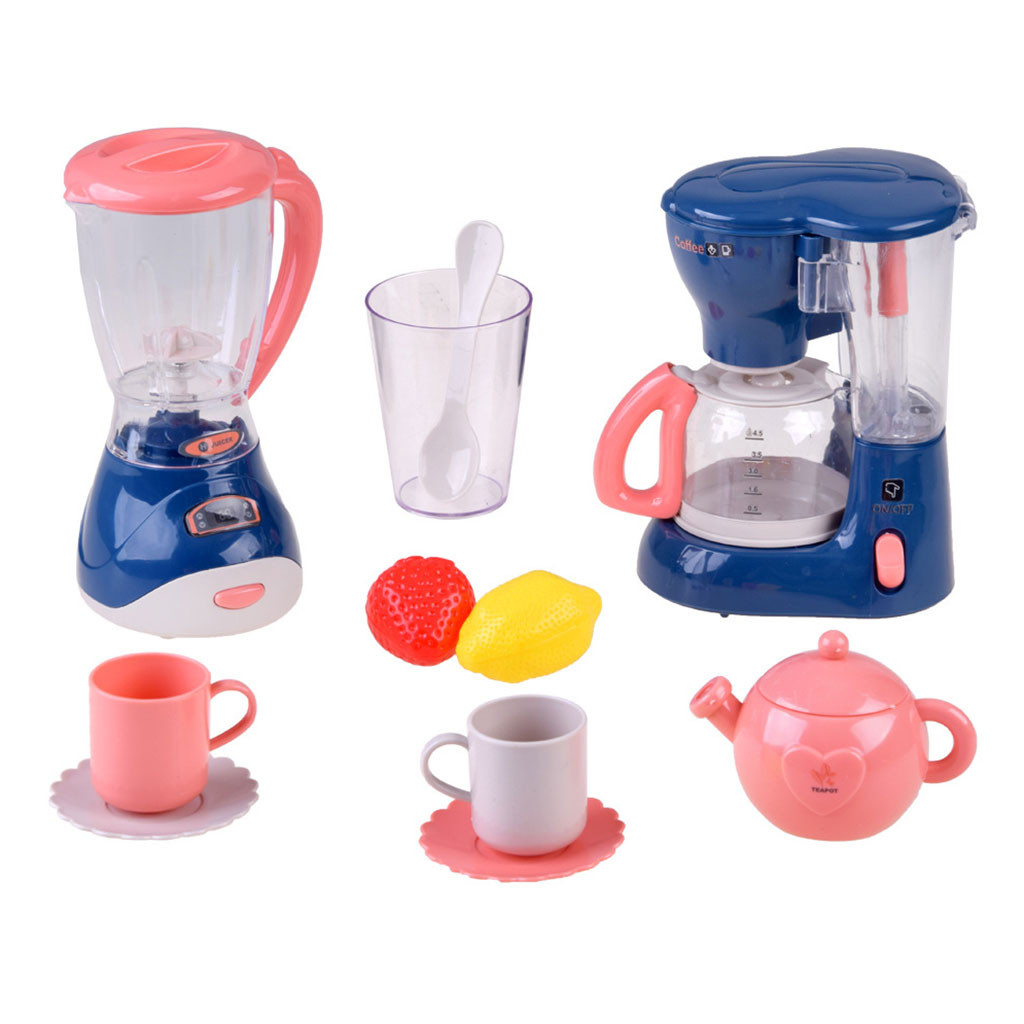 Když zapnete mixér, uslyšíte zvuk nalévání a mixování a džbán se rozsvítí. Je odnímatelný od podstavce, takže připravené smoothie lze „přelít“ do vysoké sklenice. Chcete-li kávovar zapnout, posuňte tlačítko ON/OFF a podržte jej. Po zapnutí uslyšíte zvuk mleté kávy a tekoucí vody. Nádržka na vodu je také osvětlená. Když je káva hotová, můžete vybrat konvičku z kávovaru a vychutnat si lahodný nápoj z krásných pastelových šálků. Obsah balení: kávovar, mixér, čajová lžička, džbán, 2 šálky, 2 podšálky, citron, jahoda. Mixer je napájen 2 x AA bateriemi (nejsou součástí balení). Kávovar je napájen 3 x AA bateriemi (nejsou součástí balení). Rozměry: mixér 16,5 cm x 8,5 cm x 9,5 cm, kávovar na espresso 15 cm x 11,5 cm x 9 cm, sklenice ø 3,5 cm x 4 cm, džbán 9 cm x 6 cm x 7 cm, talířek 6,5 cm. Materiál: plast. Věk: 3+.