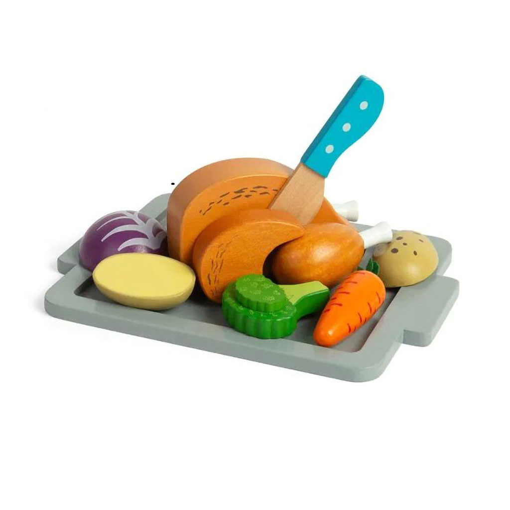 Souprava obsahuje pečené šťavnaté kuře, různé druhy zeleniny, jako je mrkev, brokolice, cibule a brambory a dřevěný nůž, který děti použijí na porcování kuřete, jehož části jsou spojeny suchým zipem pro snadné krájení. Součástí je i podnos, takže malí kuchaři a kuchařky mohou své pečlivě připravené jídlo hned servírovat. Sada je nabarvená netoxickými barvami a laky. Rozměry: 23 x 7,5 x 17 cm. Materiál: dřevo s certifikací FSC®. Věk: 1,5+.