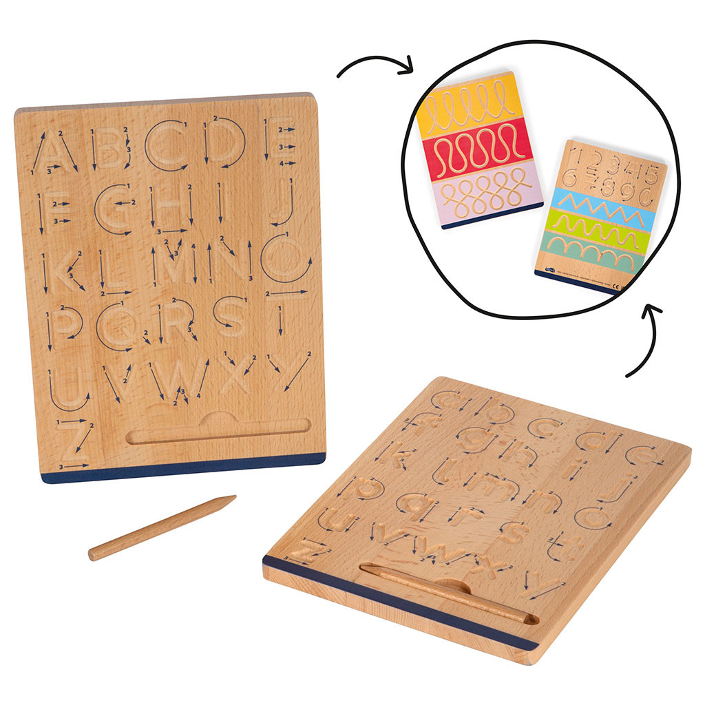 Sada dvou oboustranných dřevěných tabulek pro trénink různých úrovní grafomotoriky pro děti. Pro začátečníky jsou určeny úkoly s vyfrézovanými čarami, po kterých dítě táhne dřevěnou tužku. Pro starší děti jsou zase úkoly s vyfrézovanými číslicemi, malými a velkými písmeny. Pomůckou jsou předtištěné šipky, které indikují směr psaní a množství tahů tužkou. Dodáváno včetně dvou dřevěných tužek. Rozměry: 21 x 16 x 1 cm. Materiál: dřevo. Věk: 5+.