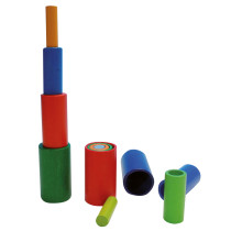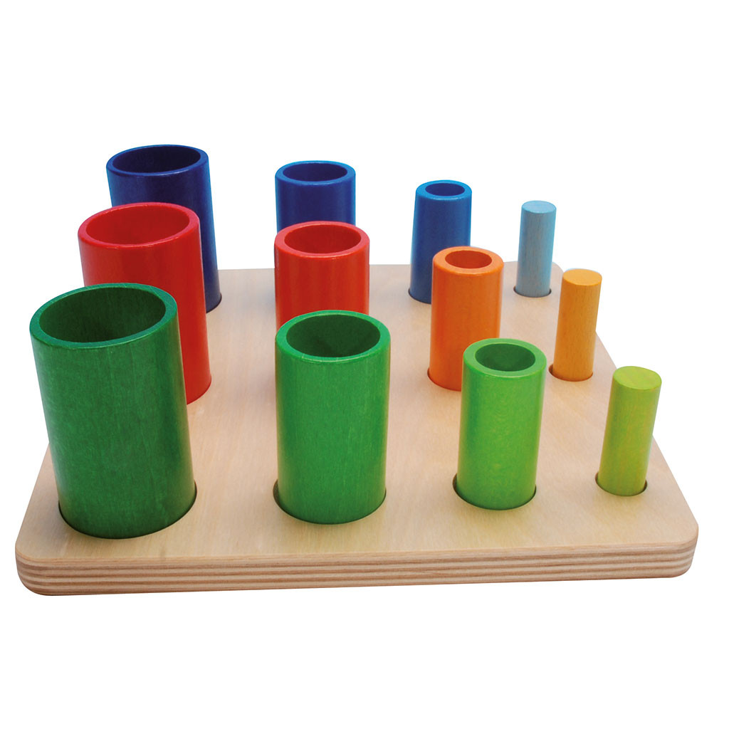 Děti vkládají barevné trubice do správných otvorů na základové desce. Trubice mají stejnou výšku, ale různý průměr a pomáhají procvičit počítání, třídění, seřazování a jemnou motoriku. Rozměry desky: 21 x 21 cm, trubice: ø1,5 cm, ø 2,3 cm, ø 3 cm, ø 4 cm. Materiál: dřevo. Věk: 3+.