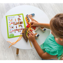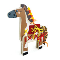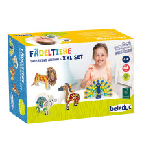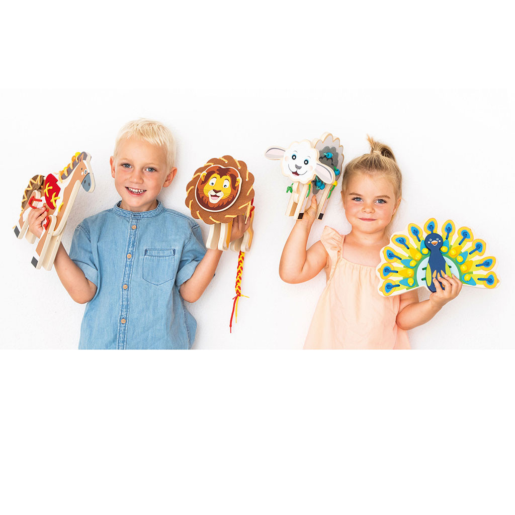 S touto maxi soupravou si může hrát několik dětí současně. Děti navlékají a navrhují zvířata nesčetnými novými způsoby. Kromě tvůrčí hry se šňůrkami a korálky poskytují předlohové karty různé nápady na figurky zvířat – lva, páva, ovečku a koně. Hotová zvířátka mohou stát zpříma. Navlékací hry podporují pochopení kvantitativních poměrů, symetrie a posloupnosti, podporují jemnou motoriku a koordinaci ruka – oko. Obsah: 19 dřevěných prvků pro 4 zvířátka, 14 šňůrek v 6 barvách, 26 plstěných dílů, 70 dřevěných korálků ve 4 barvách, 4 předlohové kartičky s návrhy zvířátek. Materiál: dřevo/textil. Věk: 4+.