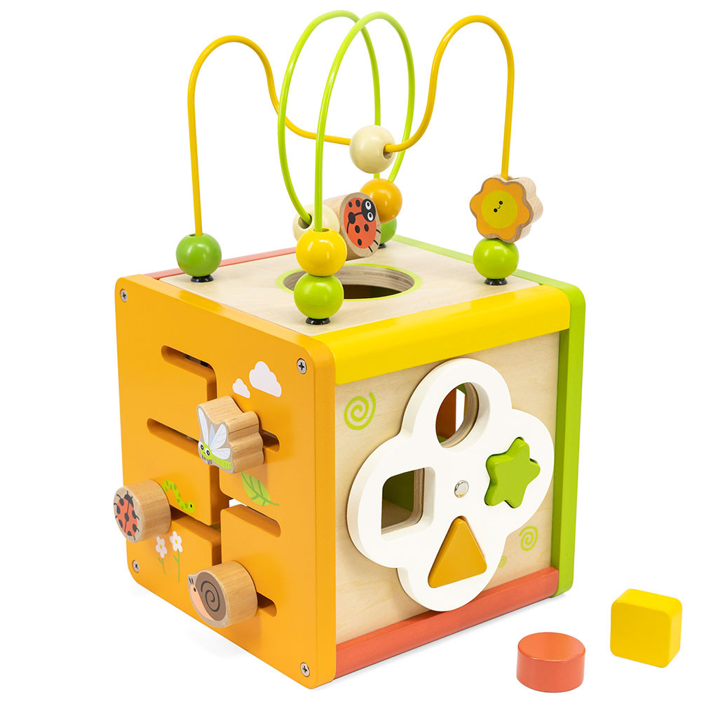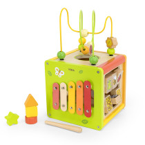 Motorická multifunkční kostka, pomocí které si dítě na rozmanitých aktivitách procvičuje jemnou motoriku, logické myšlení, kreativitu a představivost. Rozměry: 20,5 x 22,5 x 20,5 cm. Materiál: dřevo/kov. Věk: 3+.