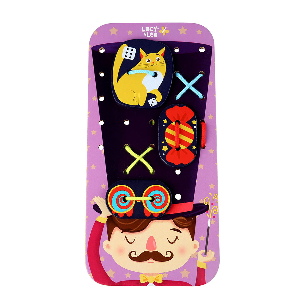 Kouzelník je dřevěný šněrovací a provlékací set, který obsahuje jednu velkou podložku, na které je vyobrazena hlava kouzelníka s jeho magickým kloboukem a mnoho barevných doplňků, které zobrazují, co všechno se může pod kloboukem skrývat, nebo na co kouzelník myslí – mince, králík, skrytá karta. Doplňky se upevňují na klobouk pomocí šněrování. Hra rozvíjí u dětí jemnou motoriku, kreativitu, estetické cítění a podporuje také znalost barev a rozlišování tvarů. Obsah balení: podložka s hlavou kouzelníku, 31 dílků, 4 šňůrky. Rozměr desky s kouzelníkem 13 cm x 27 cm - 1 ks. Rozměr ozdob 6 cm x 6 cm - 30ks. Délka šňůrek 30 cm - 4ks různé barvy. Materiál: dřevo/textil. Věk: 3+.