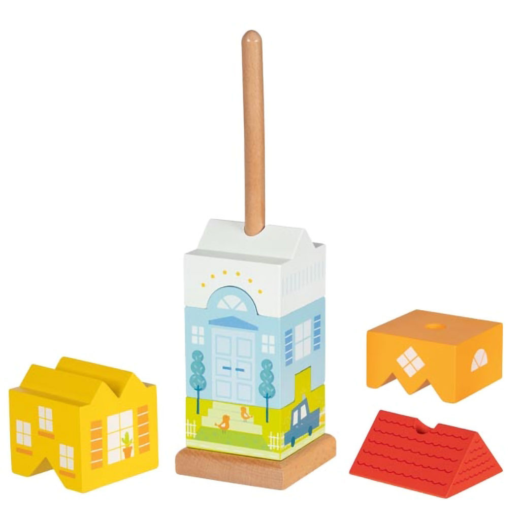 Aby městský dům vypadal opravdu tak krásně jako na obrázku, musí se nejprve na sebe pokládat 6 dílků s barevnými ilustracemi ve správném pořadí. Naštěstí tyč se základnou uprostřed drží vše v jedné linii. Každý dílek má jiný tvar a je třeba nasadit je přesně, aby vznikl dobře postavený dům. Toto je hravý způsob, jak procvičit rozpoznávání tvarů u dětí. Balení obsahuje 7 ks. Rozměry: 7,2 x 7,2 x 25,5 cm. Materiál: dřevo. Věk: 2+.