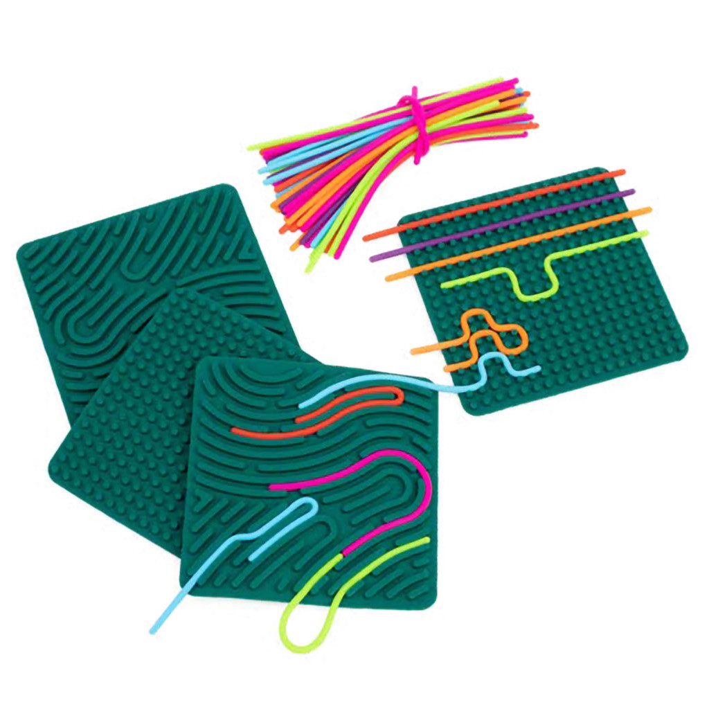 Hmatová senzorická hra stimuluje jemné motorické dovednosti, koordinaci ruka-oko a kreativitu prostřednictvím strukturovaných desek a barevných, flexibilních silikonových šňůrek. Sada obsahuje: 4 oboustranné silikonové desky (15 x 15 cm), 72 silikonových nití (18 cm), 12 logických oboustranných karet (21 x 14,8 cm). Materiál: silikon. Věk: 3+.
