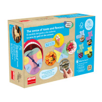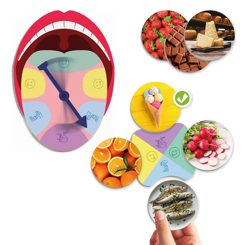 Objevte, jak funguje smysl pro chuť a roli chuťových pohárků. Asociační hra se skutečnými obrázky, která umožňuje dětem identifikovat a poznávat potraviny podle základních chutí: sladká, slaná, hořká a kyselá. Ruleta ve tvaru úst ukazuje části jazyka, které rozlišují různé chutě a ke kterým děti přiřazují obrázky potravin. Při hře si děti zároveň procvičí pozornost, soustředění a slovní zásobu. Balení obsahuje 32 kulatých karet s fotografiemi potravin, 8 hlavních karet s chutěmi, ruletu a návod. Rozměry: kulatá karta ø 5 cm, karta 5,8 x 5,8 cm, ruleta 12 x 16,8 cm. Materiál: karton. Věk: 3+.