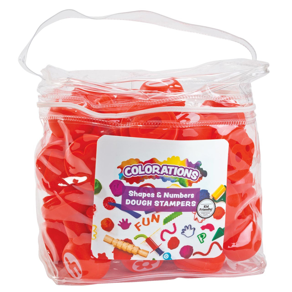 Speciálně navržená razítka do plastelíny mají robustní plastové rukojeti, které se snadno drží. Obsahují motivy číslic 0 - 9, broučka, motýla, auto, kočku, kruh, dinosaura, kachnu, rybu, květ, srdce, dopis, otisk tlapky, raketovou loď, čtverec, hvězdu a trojúhelník. Razítka jsou snadno čistitelná a mají nepřilnavý povrch. Uloženy jsou v plastovém zavíratelném sáčku. Razítkové otisky mají cca 3 cm. Rozměry: výška 7,5 cm, ø 4 cm. Materiál: plast. Věk: 3+.