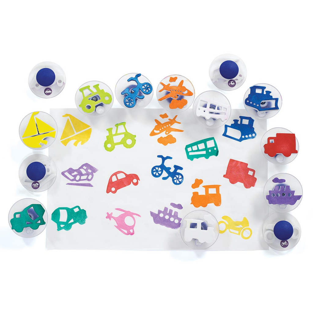 Sada razítek s dopravní tématikou obsahuje 14 kusů motivů – auto, motorku, autobus, loď, letadlo, kolo, traktor a jiné. Průhledná základna umožňuje dětem vidět, kam otiskují obrázek. Pěnová razítka se snadno myjí a mají jednoduché uchopení. Neobsahují latex, takže jsou pro děti bezpečná. Baleny jsou v plastovém přenosném boxu. Materiál: plast/pěnová guma. Rozměr: Ø 7,6 cm. Věk: 3+.