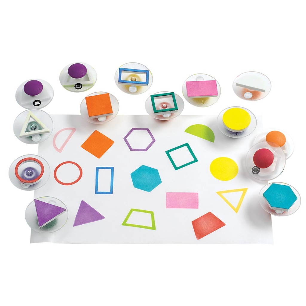 Sada razítek obsahuje 7 ks plných a 7 ks obrysů základních geometrických tvarů. Průhledná základna umožňuje dětem vidět, kam otiskují obrázek. Pěnová razítka se snadno myjí a mají jednoduché uchopení. Neobsahují latex, takže jsou pro děti bezpečná. Baleno v průhledném plastovém kufříku. Materiál: plast/pěnová guma. Rozměr: Ø 7,5 cm. Věk: 3+.
