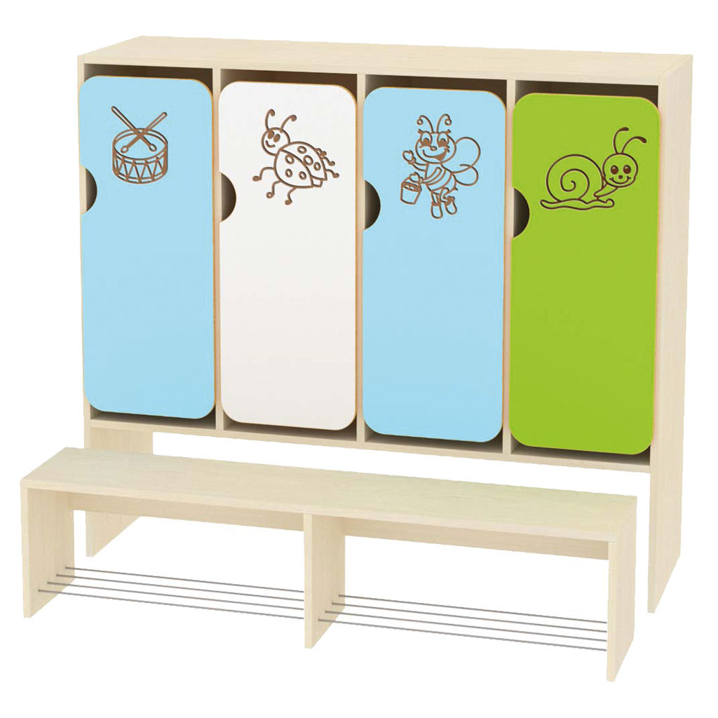 Šatny jsou vyrobeny z 18 mm DTD desky, která má zaoblenou ABS bezpečnostní hranu o tloušťce 2 mm. Dvířka jsou vyrobena ze 12 mm MDF desky, mají zaoblenou hranu. Na dvířka lze frézovat vzory, na výběr máte 92 motivů. Součástí šatny je odnímatelná lavička s roštem. Každá přihrádka má jeden dvojitý háček, který si, za příplatek 80 Kč na jednu buňku, můžete zaměnit za tyč na ramínko. V tom případě za kód připište písmeno T. Vybrat si můžete korpus javor nebo buk.