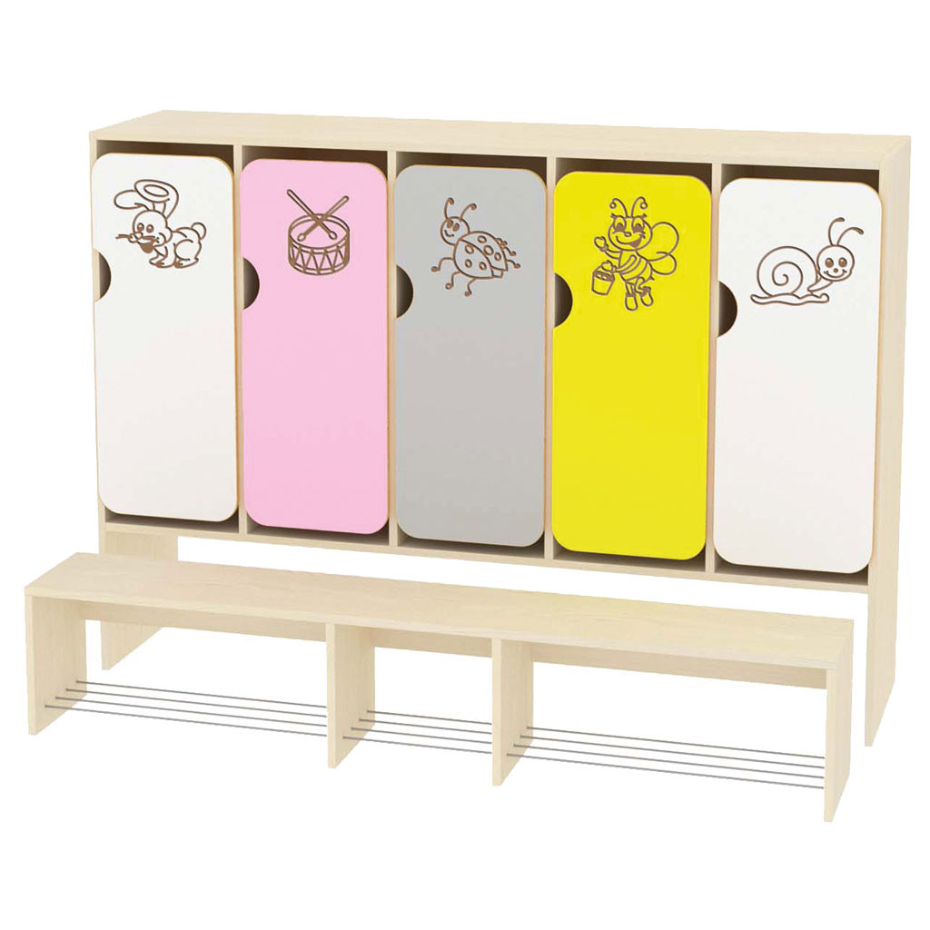 Šatny jsou vyrobeny z 18 mm DTD desky, která má zaoblenou ABS bezpečnostní hranu o tloušťce 2 mm. Dvířka jsou vyrobena ze 12 mm MDF desky, mají zaoblenou hranu. Na dvířka lze frézovat vzory, na výběr máte 92 motivů. Součástí šatny je odnímatelná lavička s roštem. Každá přihrádka má jeden dvojitý háček, který si, za příplatek 80 Kč na jednu buňku, můžete zaměnit za tyč na ramínko. V tom případě za kód připište písmeno T. Vybrat si můžete korpus javor nebo buk.