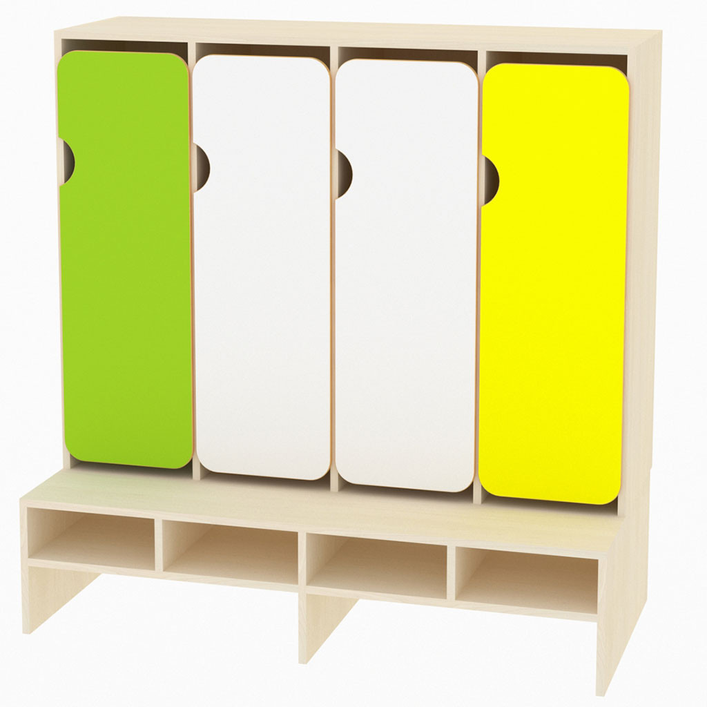 Šatny jsou vyrobeny z 18 mm DTD desky, která má zaoblenou ABS bezpečnostní hranu o tloušťce 2 mm. Dvířka jsou vyrobeny ze 12 mm MDF desky, mají zaoblenou hranu. Na dvířka se dají frézovat vzory, na výběr máte 92 motivů. Součástí šatny je pevná lavička. Každá přihrádka má jeden dvojitý háček, který si, za příplatek 80,- Kč na jednu buňku, můžete zaměnit za tyč na ramínko. V tom případě za kód připište písmeno T. Vybrat si můžete korpus javor nebo buk.