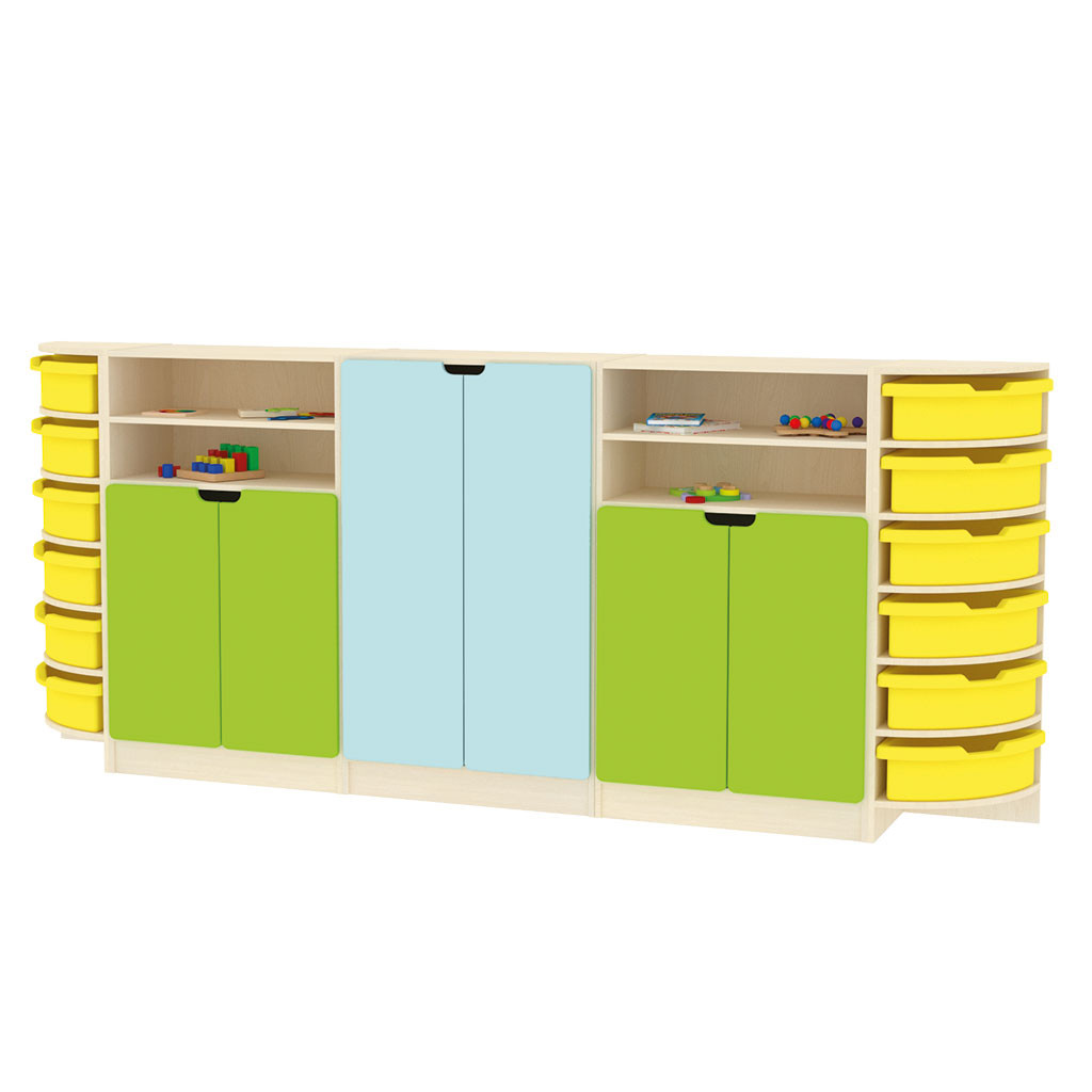 3D Sestavy jsou vyrobeny z 18 mm DTD desky, která má zaoblenou ABS bezpečnostní hranu o tloušťce 2 mm. Dvířka jsou vyrobeny ze 16 mm MDF desky, jsou potaženy barevnou fólií a také mají zaoblenou hranu. Vybrat si můžete korpus javor nebo buk. Máte možnost vybrat si sestavu podle našeho návrhu, (obrázek), nebo si vytvořit vlastní sestavu kombinací 3D skříněk z naší nabídky, barevností a motivů podle vašich potřeb. Na výběr máte 9 barev, 92 samostatně frézovaných motivů, 41 příběhů a nespočet kombinací. Matrace se objednává samostatně pro všechny sestavy s domečkem- možnost výběru barvy. Cena bez kontejnerů Gratnells a vodících lišt - možnost výběru barvy.