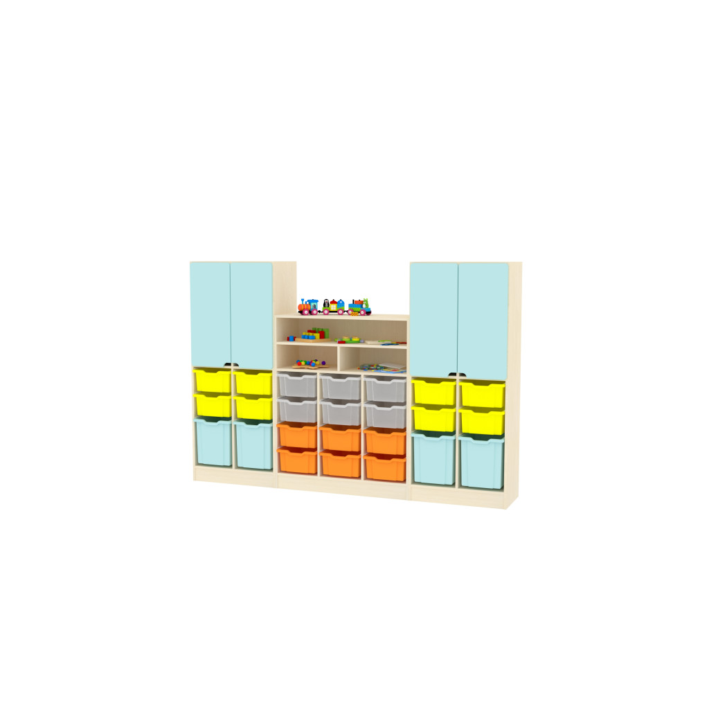 3D Sestavy jsou vyrobeny z 18 mm DTD desky, která má zaoblenou ABS bezpečnostní hranu o tloušťce 2 mm. Dvířka jsou vyrobeny ze 16 mm MDF desky, jsou potaženy barevnou fólií a také mají zaoblenou hranu. Vybrat si můžete korpus javor nebo buk. Máte možnost vybrat si sestavu podle našeho návrhu, (obrázek), nebo si vytvořit vlastní sestavu kombinací 3D skříněk z naší nabídky, barevností a motivů podle vašich potřeb. Na výběr máte 9 barev, 92 samostatně frézovaných motivů, 41 příběhů a nespočet kombinací. Matrace se objednává samostatně pro všechny sestavy s domečkem- možnost výběru barvy. Cena bez kontejnerů Gratnells a vodících lišt - možnost výběru barvy.