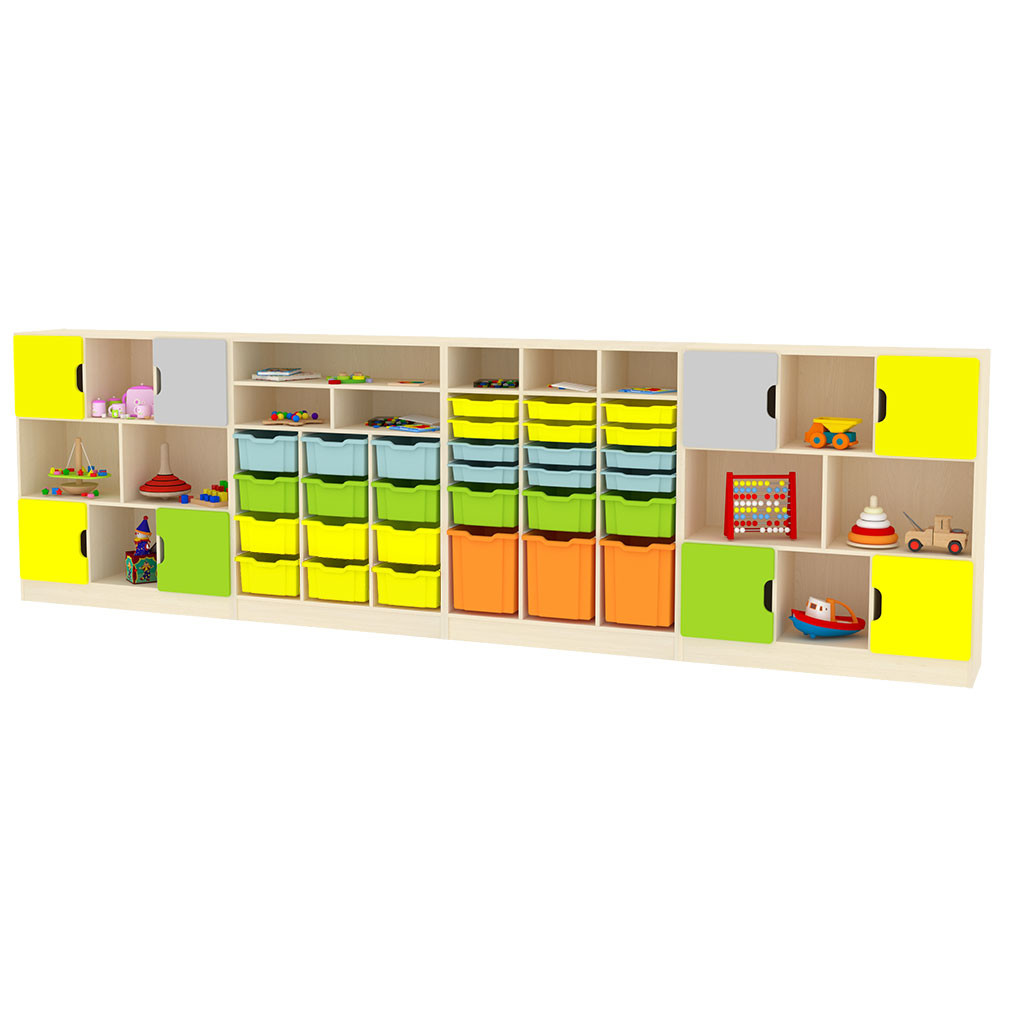 3D Sestavy jsou vyrobeny z 18 mm DTD desky, která má zaoblenou ABS bezpečnostní hranu o tloušťce 2 mm. Dvířka jsou vyrobeny ze 16 mm MDF desky, jsou potaženy barevnou fólií a také mají zaoblenou hranu. Vybrat si můžete korpus javor nebo buk. Máte možnost vybrat si sestavu podle našeho návrhu, (obrázek), nebo si vytvořit vlastní sestavu kombinací 3D skříněk z naší nabídky, barevností a motivů podle vašich potřeb. Na výběr máte 9 barev, 92 samostatně frézovaných motivů, 41 příběhů a nespočet kombinací. Matrace se objednává samostatně pro všechny sestavy s domečkem- možnost výběru barvy. Cena bez kontejnerů Gratnells a vodících lišt - možnost výběru barvy.