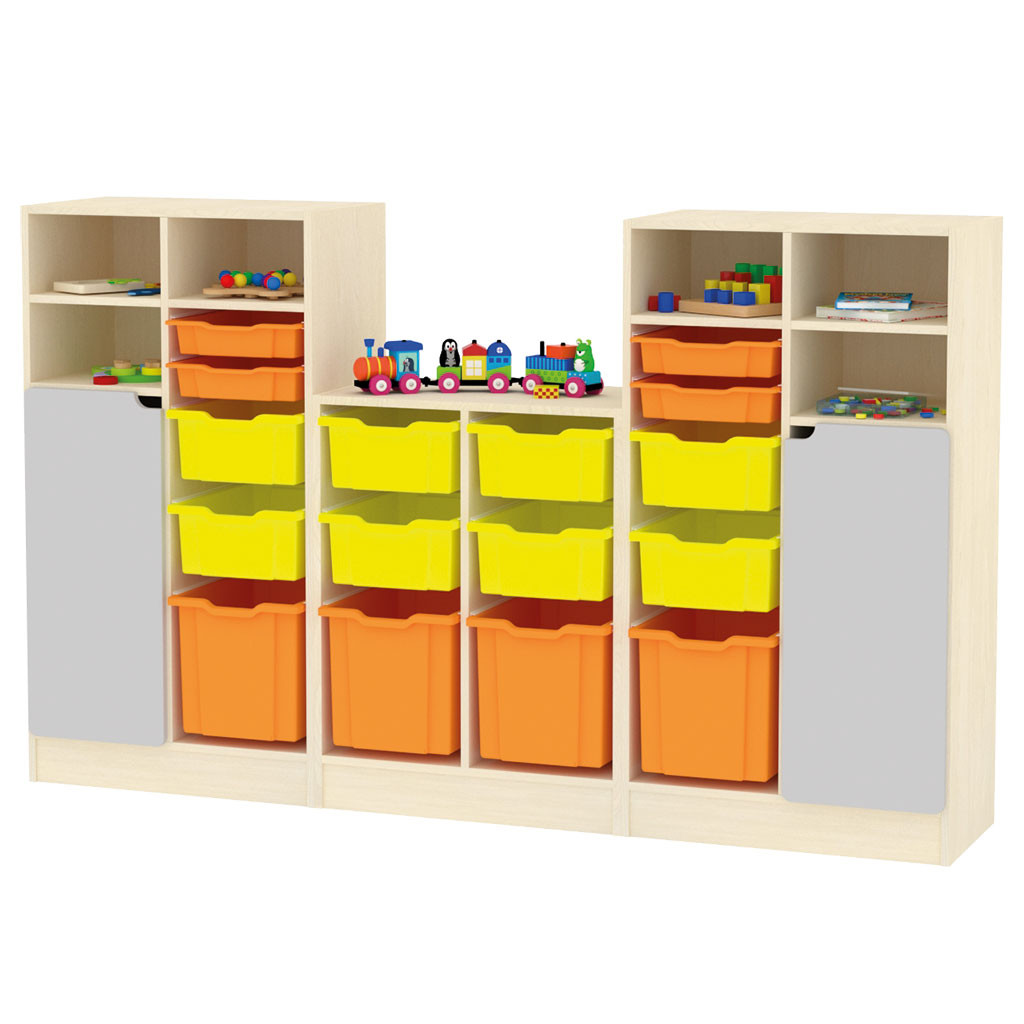 3D Sestavy jsou vyrobeny z 18 mm DTD desky, která má zaoblenou ABS bezpečnostní hranu o tloušťce 2 mm. Dvířka jsou vyrobeny ze 16 mm MDF desky, jsou potaženy barevnou fólií a také mají zaoblenou hranu. Vybrat si můžete korpus javor nebo buk. Máte možnost vybrat si sestavu podle našeho návrhu, (obrázek), nebo si vytvořit vlastní sestavu kombinací 3D skříněk z naší nabídky, barevností a motivů podle vašich potřeb. Na výběr máte 9 barev, 92 samostatně frézovaných motivů, 41 příběhů a nespočet kombinací. Matrace se objednává samostatně pro všechny sestavy s domečkem- možnost výběru barvy. Cena bez kontejnerů Gratnells a vodících lišt - možnost výběru barvy.