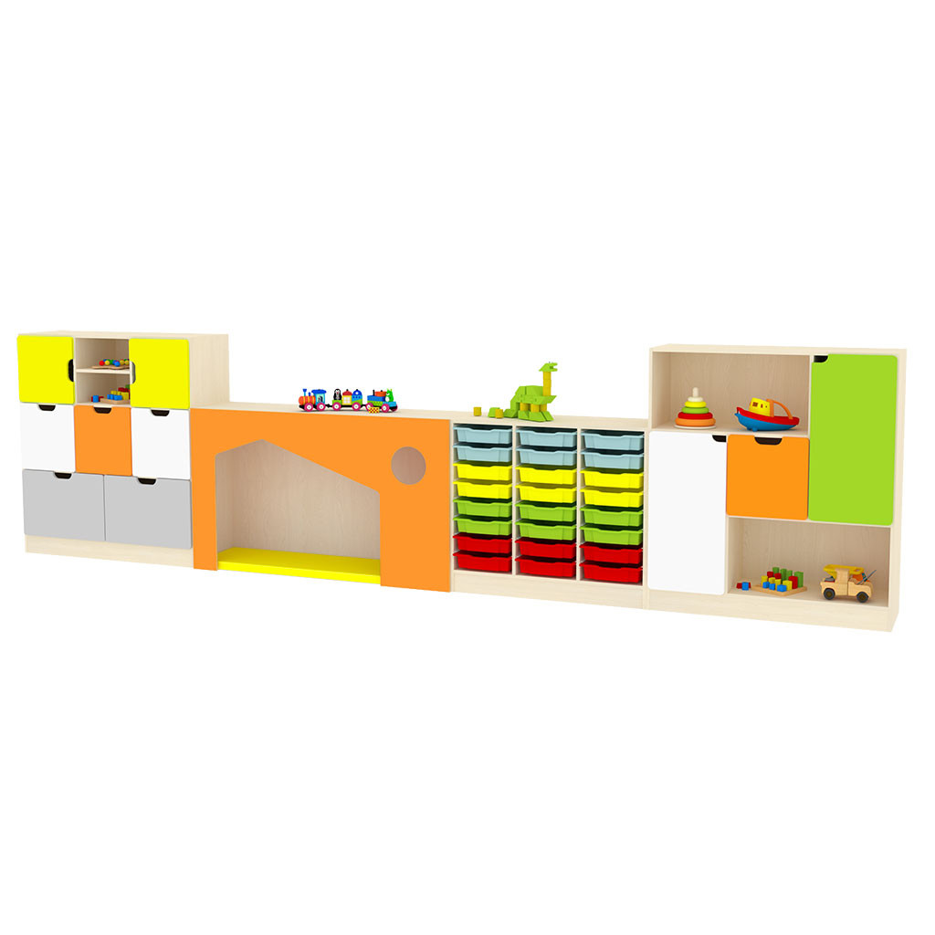 3D Sestavy jsou vyrobeny z 18 mm DTD desky, která má zaoblenou ABS bezpečnostní hranu o tloušťce 2 mm. Dvířka jsou vyrobeny ze 16 mm MDF desky, jsou potaženy barevnou fólií a také mají zaoblenou hranu. Vybrat si můžete korpus javor nebo buk. Máte možnost vybrat si sestavu podle našeho návrhu, (obrázek), nebo si vytvořit vlastní sestavu kombinací 3D skříněk z naší nabídky, barevností a motivů podle vašich potřeb. Na výběr máte 9 barev, 92 samostatně frézovaných motivů, 41 příběhů a nespočet kombinací. Matrace se objednává samostatně pro všechny sestavy s domečkem- možnost výběru barvy. Cena bez kontejnerů Gratnells a vodících lišt - možnost výběru barvy.