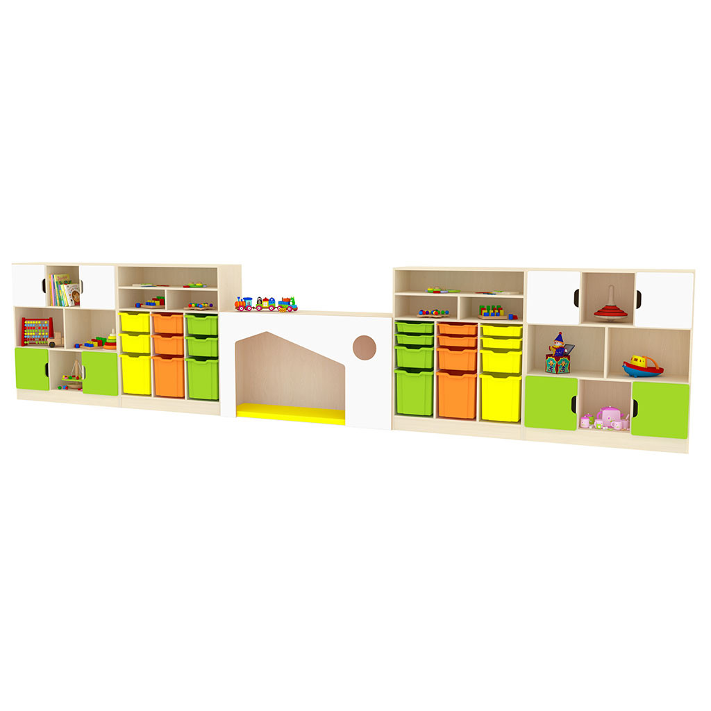 3D Sestavy jsou vyrobeny z 18 mm DTD desky, která má zaoblenou ABS bezpečnostní hranu o tloušťce 2 mm. Dvířka jsou vyrobeny ze 16 mm MDF desky, jsou potaženy barevnou fólií a také mají zaoblenou hranu. Vybrat si můžete korpus javor nebo buk. Máte možnost vybrat si sestavu podle našeho návrhu, (obrázek), nebo si vytvořit vlastní sestavu kombinací 3D skříněk z naší nabídky, barevností a motivů podle vašich potřeb. Na výběr máte 9 barev, 92 samostatně frézovaných motivů, 41 příběhů a nespočet kombinací. Matrace se objednává samostatně pro všechny sestavy s domečkem- možnost výběru barvy. Cena bez kontejnerů Gratnells a vodících lišt - možnost výběru barvy.