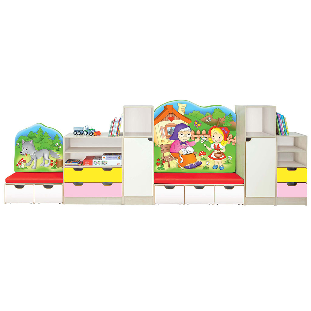 Nábytkové sestavy Molitánek jsou vyrobeny z 18 mm DTD desky, která má zaoblenou ABS bezpečnostní hranu o tloušťce 2 mm. Dvířka jsou vyrobeny ze 12 mm laminované MDF desky, mají zaoblenou hranu. Vybrat si můžete korpus javor nebo buk. Máte možnost vybrat si sestavu podle našeho návrhu, (obrázek), nebo si vytvořit vlastní sestavu kombinací skříněk podle vašich potřeb. V ceně sestavy jsou i dekorační molitany a matrace na sedacích skříňkách. V nabídce máme 5 barev matrací a různé dekorační molitany, které si také můžete zkombinovat podle vašich představ.