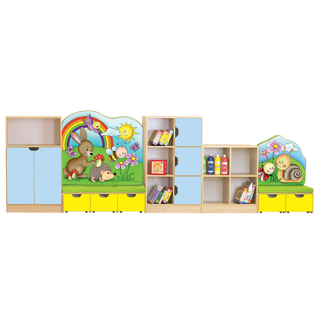 Nábytkové sestavy Molitánek jsou vyrobeny z 18 mm DTD desky, která má zaoblenou ABS bezpečnostní hranu o tloušťce 2 mm. Dvířka jsou vyrobeny ze 12 mm laminované MDF desky, mají zaoblenou hranu. Vybrat si můžete korpus javor nebo buk. Máte možnost vybrat si sestavu podle našeho návrhu, (obrázek), nebo si vytvořit vlastní sestavu kombinací skříněk podle vašich potřeb. V ceně sestavy jsou i dekorační molitany a matrace na sedacích skříňkách. V nabídce máme 5 barev matrací a různé dekorační molitany, které si také můžete zkombinovat podle vašich představ.
