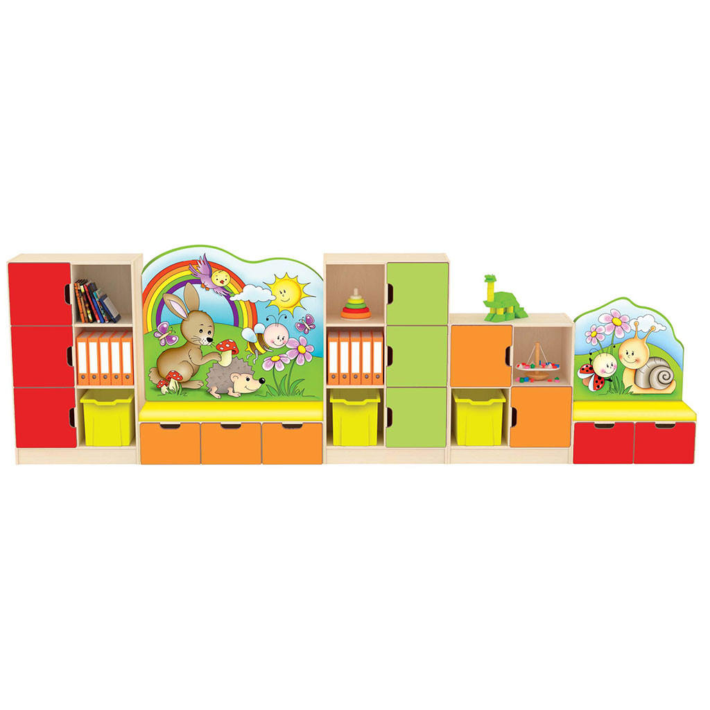 Nábytkové sestavy Molitánek jsou vyrobeny z 18 mm DTD desky, která má zaoblenou ABS bezpečnostní hranu o tloušťce 2 mm. Dvířka jsou vyrobeny ze 12 mm laminované MDF desky, mají zaoblenou hranu. Vybrat si můžete korpus javor nebo buk. Máte možnost vybrat si sestavu podle našeho návrhu, (obrázek), nebo si vytvořit vlastní sestavu kombinací skříněk podle vašich potřeb. V ceně sestavy jsou i dekorační molitany a matrace na sedacích skříňkách. V nabídce máme 5 barev matrací a různé dekorační molitany, které si také můžete zkombinovat podle vašich představ.