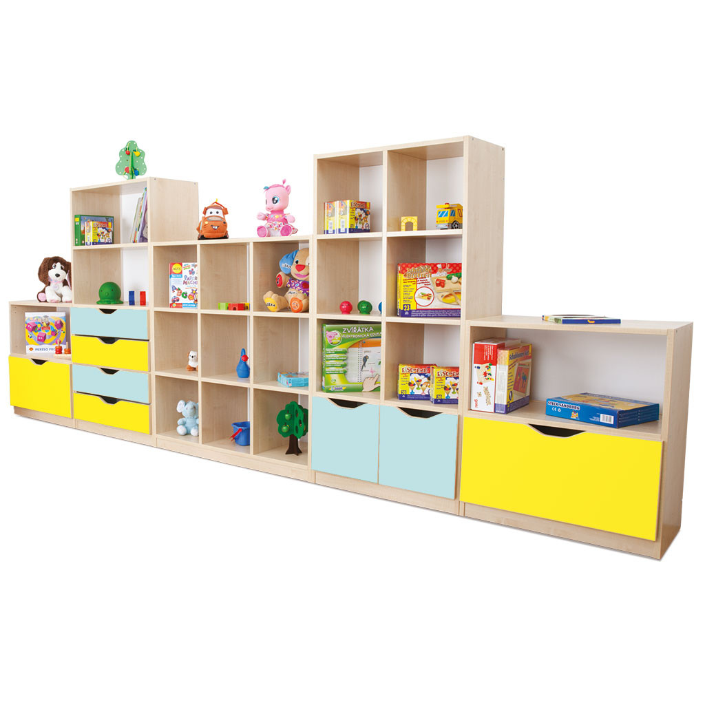 Nábytkové sestavy MULTI jsou vyrobeny z 18 mm DTD desky, která má zaoblenou ABS bezpečnostní hranu o tloušťce 2 mm. Dvířka a čela kontejnerů jsou také vyrobeny z 12 mm laminované MDF desky. Vybrat si můžete korpus javor nebo buk. Máte možnost vybrat si sestavu podle našeho návrhu, (obrázek), nebo si vytvořit vlastní sestavu kombinací skříněk a barevností podle vašich potřeb. Sestavy se skládají z praktických skříněk, které jednoduchým přesunutím můžete umístit v prostoru a vytvořit tak různé zóny.