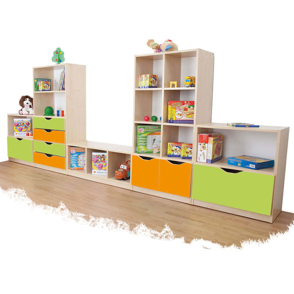 Nábytkové sestavy MULTI jsou vyrobeny z 18 mm DTD desky, která má zaoblenou ABS bezpečnostní hranu o tloušťce 2 mm. Dvířka a čela kontejnerů jsou také vyrobeny z 12 mm laminované MDF desky. Vybrat si můžete korpus javor nebo buk. Máte možnost vybrat si sestavu podle našeho návrhu, (obrázek), nebo si vytvořit vlastní sestavu kombinací skříněk a barevností podle vašich potřeb. Sestavy se skládají z praktických skříněk, které jednoduchým přesunutím můžete umístit v prostoru a vytvořit tak různé zóny.
