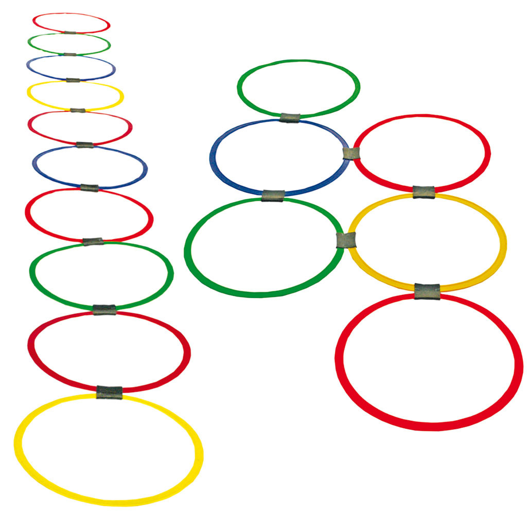 Sada koordinačních obručí se skládá z 20 kruhů a 25 spojovacích dílů, které vám umožňují vytvářet si vlastní cesty a aktivity. Dodáváno s taškou na přenášení. Rozměry: ø 39 cm. Materiál: plast. Věk: 3+.