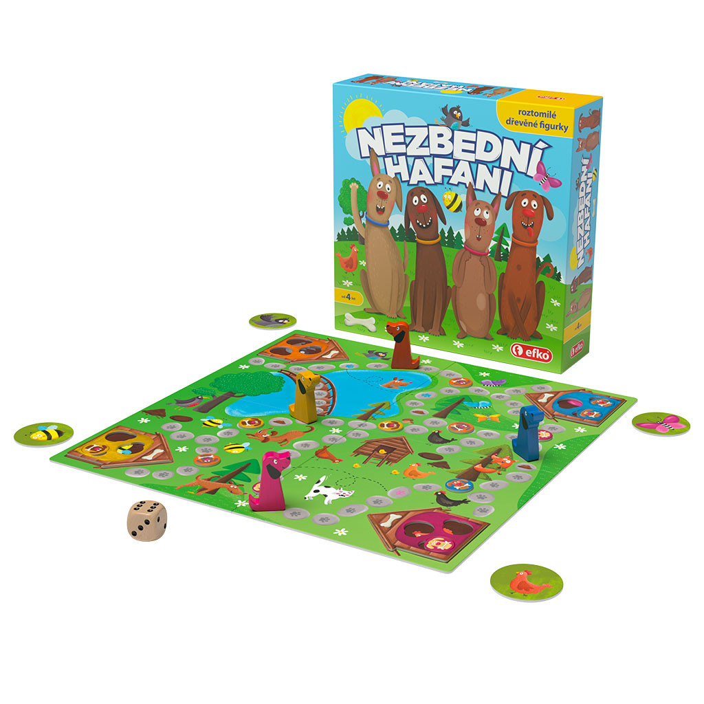 Zatímco psí maminky Bela, Hela, Nela a Stela vařily štěňátkům oběd, nezbední psíci se mezitím rozutíkali po zahradě. Je čas oběda a psí maminky musí zahnat svá štěňátka domů. Která fena to zvládne nejrychleji? Hra, kterou pochopí i ti nejmenší a během pár minut mohou začít hrát. Žádné složité přípravy, žádné komplikované strategie, jen zábava. Hra je navržena tak, aby kromě zábavy rozvíjela důležité dovednosti dětí. Díky manipulaci s dřevěnými figurkami pejsků, které se dobře drží, si děti procvičí jemnou motoriku, zatímco čekání na svůj tah je naučí trpělivosti. Vyrobeno v ČR. Balení obsahuje: herní plán, 4 dřevěné figurky pejsků (4 cm výška), 12 žetonů, 4 budky, hrací kostku, CZ/SK návod. Materiál: karton/dřevo. Věk: 4+.