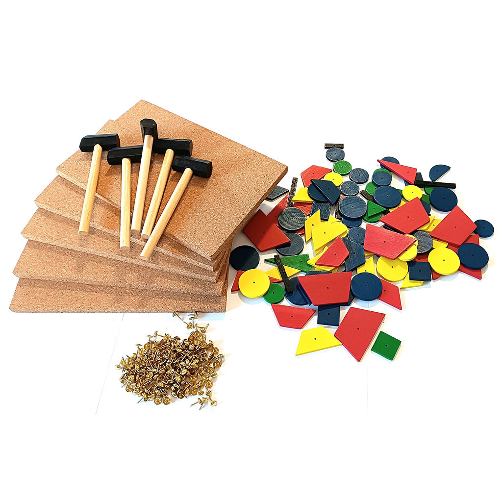 Sada obsahuje 5 ks korkových podložek, 5 kladiv, 200 ks kovových hřebíků, 300 dřevěných tvarů. Baleno v plastovém boxu. Rozměry korkové podložky: 22,50 x 15 x 1 cm. Materiál: korek/kov/dřevo. Věk: 3+.