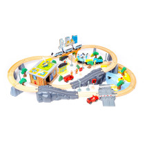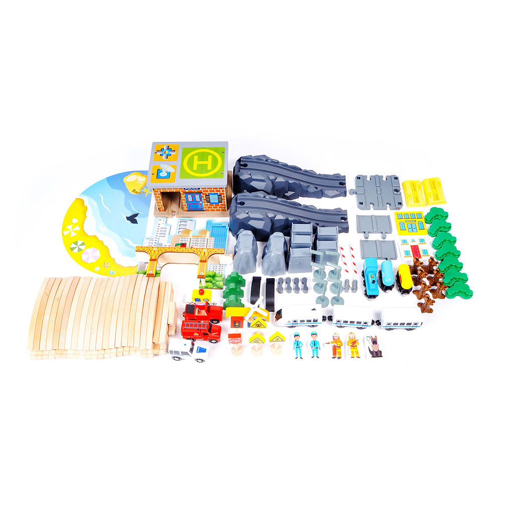 Dřevěná vláčkodráha s bohatým příslušenstvím je určena pro všechny děti, které milují vlaky a vše kolem nich. Souprava je nápaditou a interaktivní zábavou, při které si děti vydrží hrát hodně dlouho. Různé díly vláčkodráhy lze libovolně kombinovat a skládat a je dostatečně velká na to, aby si s ní mohlo hrát více dětí najednou. Do oblouku tvarované rohy všech dílků dráhy předcházejí zranění dětí. Vláček funguje na 1× AA baterii, která není součástí balení. Balení obsahuje 95 dílů – části kolejnic s mostem, vlaky, lokomotivu, vagóny, zastávku, auta, budovy, figurky, dopravní značky, vrtulník a stromy. Materiál: dřevo. Věk 3+.